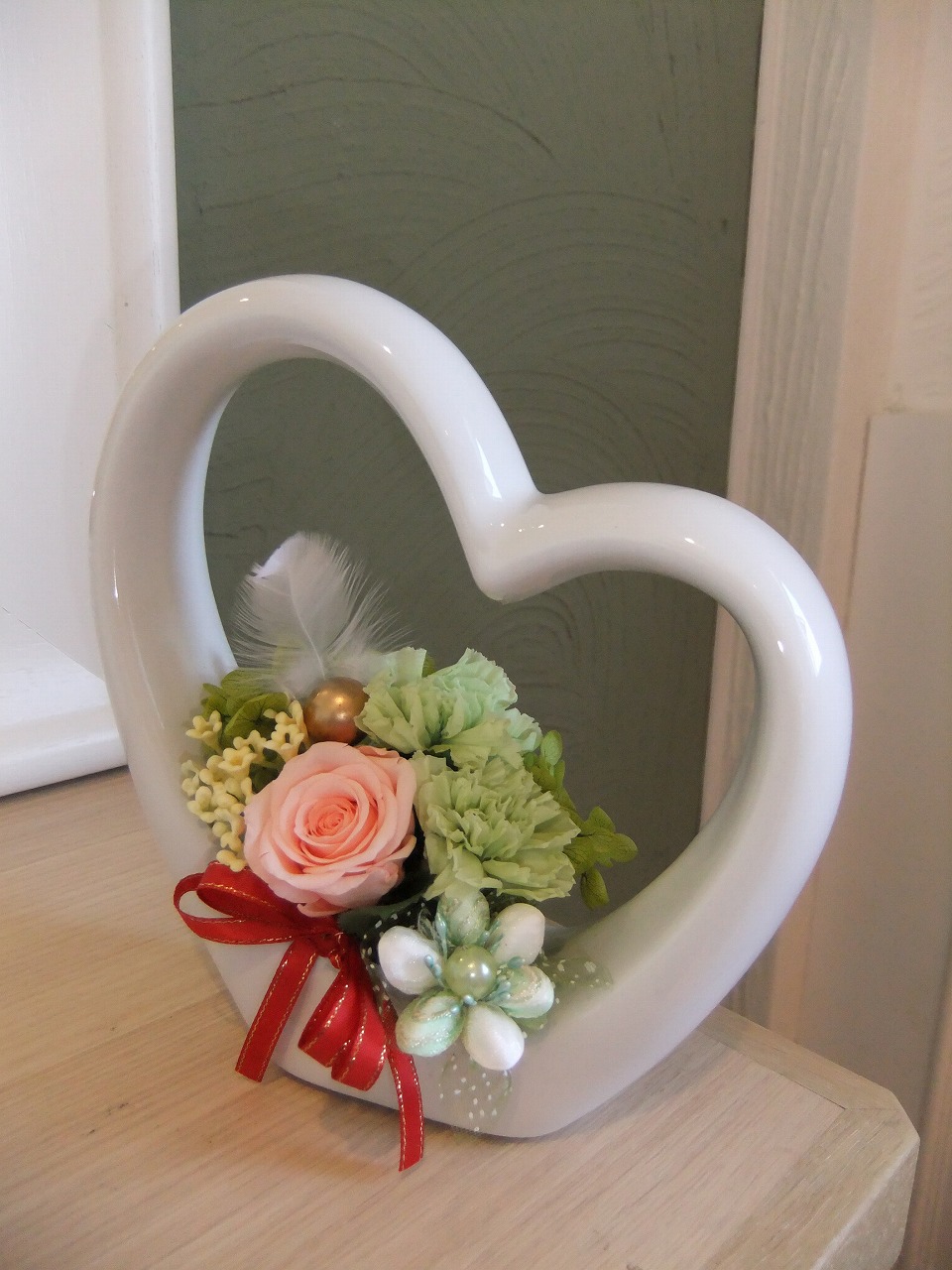 ハート型の花器にナチュラルなデザインのプリザーブドフラワーが咲きました✽カーネーションも添えられ母の日ギフト好適品です。